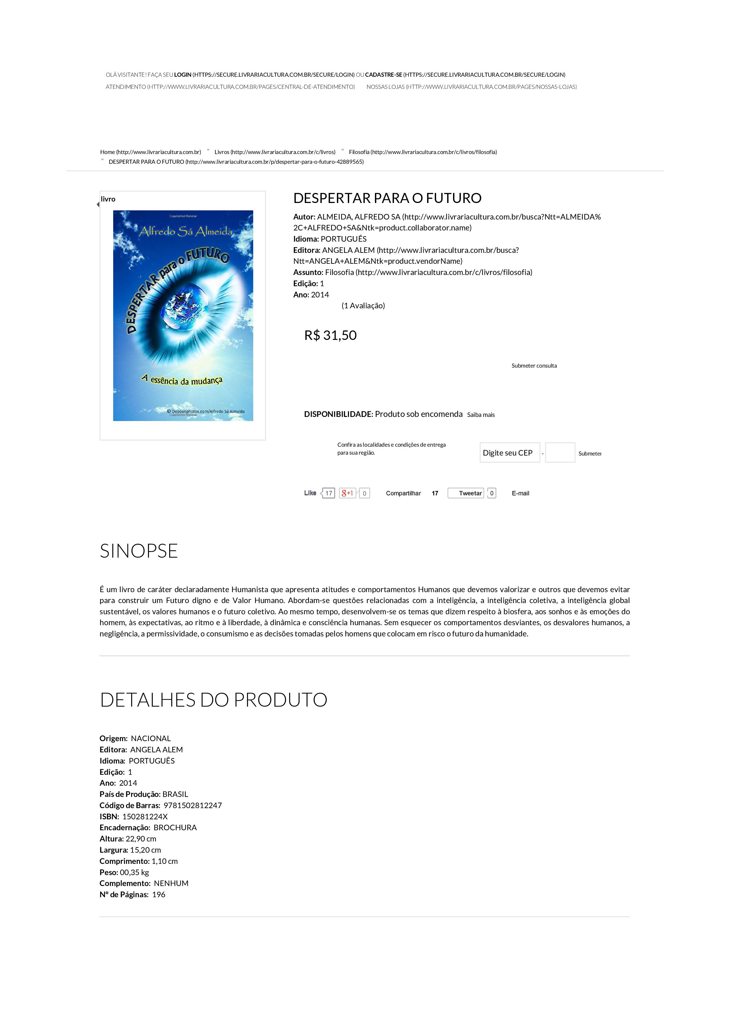 O meu livro “Despertar para o Futuro” está igualmente disponível na Livraria Cultura (Brasil) – todas as filiais – em formato papel, pelo preço de R$ 31,50 (http://www.livrariacultura.com.br/p/despertar-para-o-futuro…).