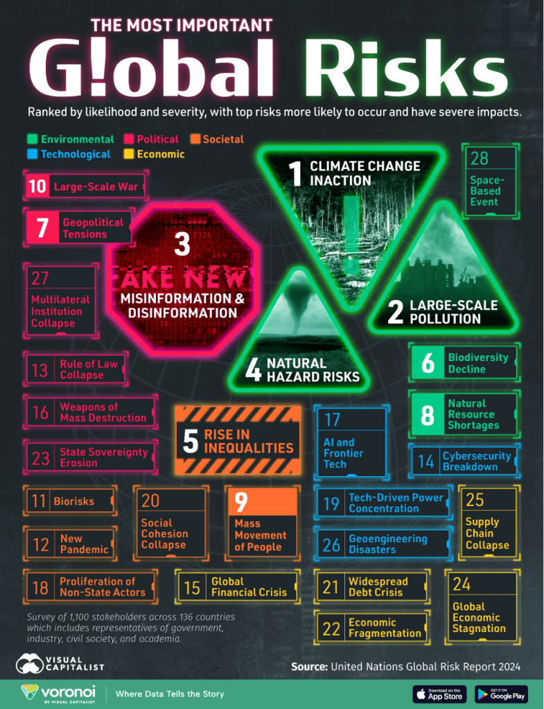 Vamos vislumbrar, através de informação sobre os 28 Riscos Globais mais importantes, em que estado se encontra a nossa Realidade. Estes estão classificados por probabilidade e gravidade, com os principais riscos mais propensos a ocorrer e ter impactos severos. A pesquisa foi realizada com 1.100 partes interessadas, através de 136 Países, que incluíram representantes: Governamentais; Industriais; Sociedade Civil e Academia.